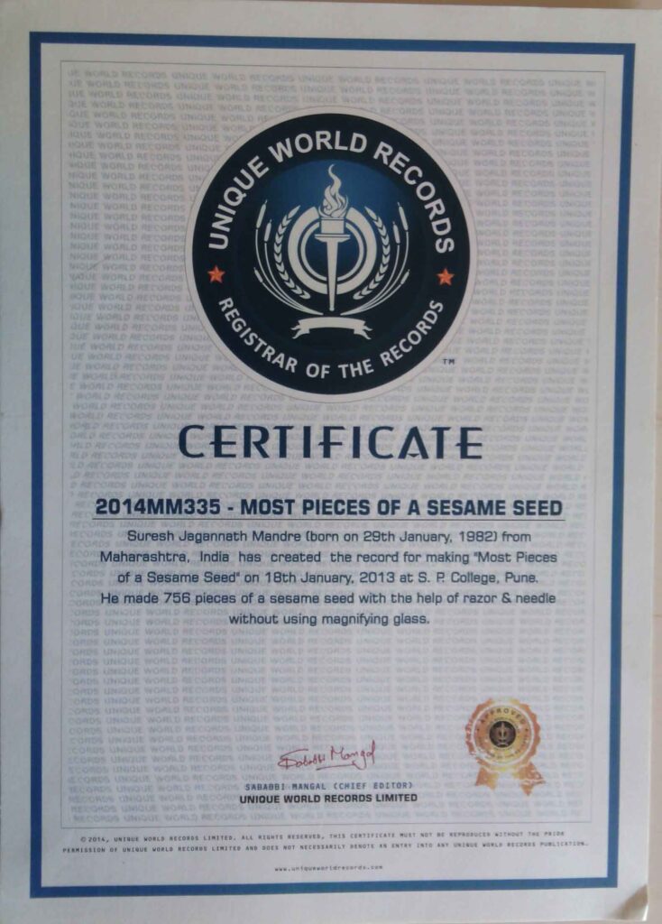 कोणत्याही भिंगाचा वापर न करता एका तिळाचे २२५, ६०० आणि ७५६ तुकडे करण्याचा विक्रम